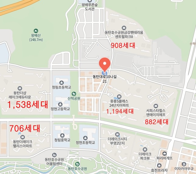 본 매물이 위치한 산척동(동탄대로10나길 21) 일대는 외부로 수요가 분산되지 않는 전형적인 **’항아리 상권’**입니다. 상권 분석 리포트에 따르면, 본 매물을 중심으로 도보 이용이 가능한 주요 아파트 단지 세대수는 다음과 같습니다.